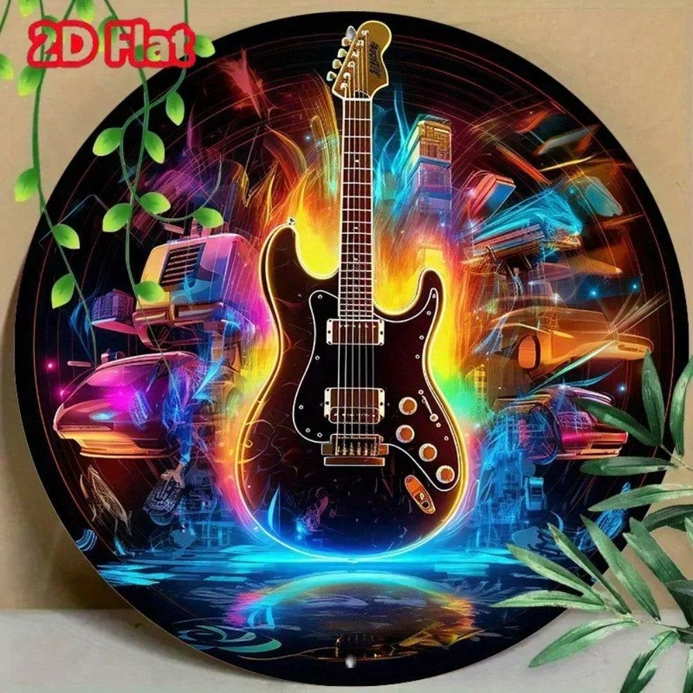 Rund Aluminium Neonskylt Med Musiknoter Gitarr Modern Väggkonst