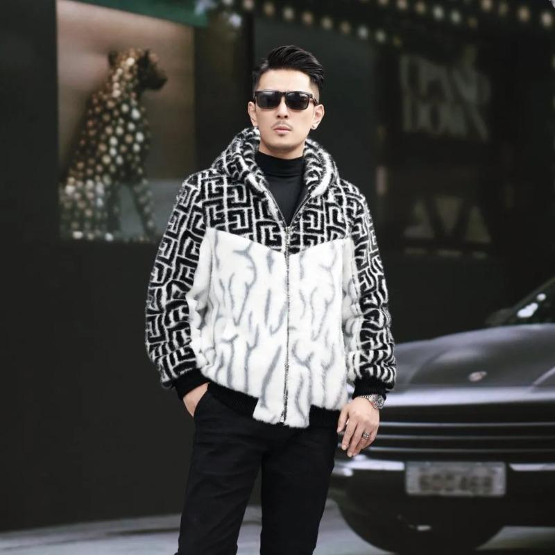 Herr lyxig monogram fuskpälsjacka med ståkrage, dragkedja, varm vinterkappa