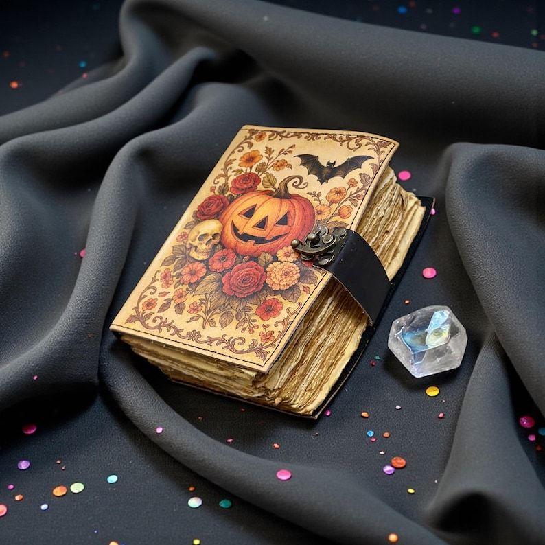 Handmade Halloween Pumpkin Leather Journal | Floral Witchy Grimoire Notebook | Vintage Notebook with Lock Closure