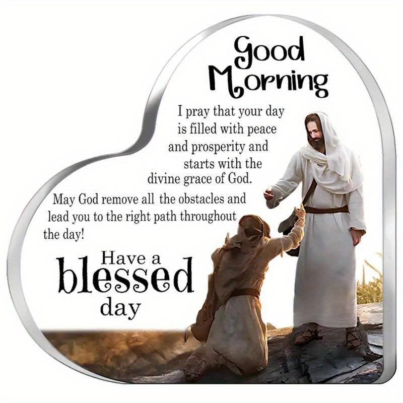 2D Platt, "God Morgon Välsignelse" Akryl Hjärtformad Kristet Gåva Skrivbordsdekoration Plakett, Lämplig för väggdekoration, veranda, rum, villa, acce