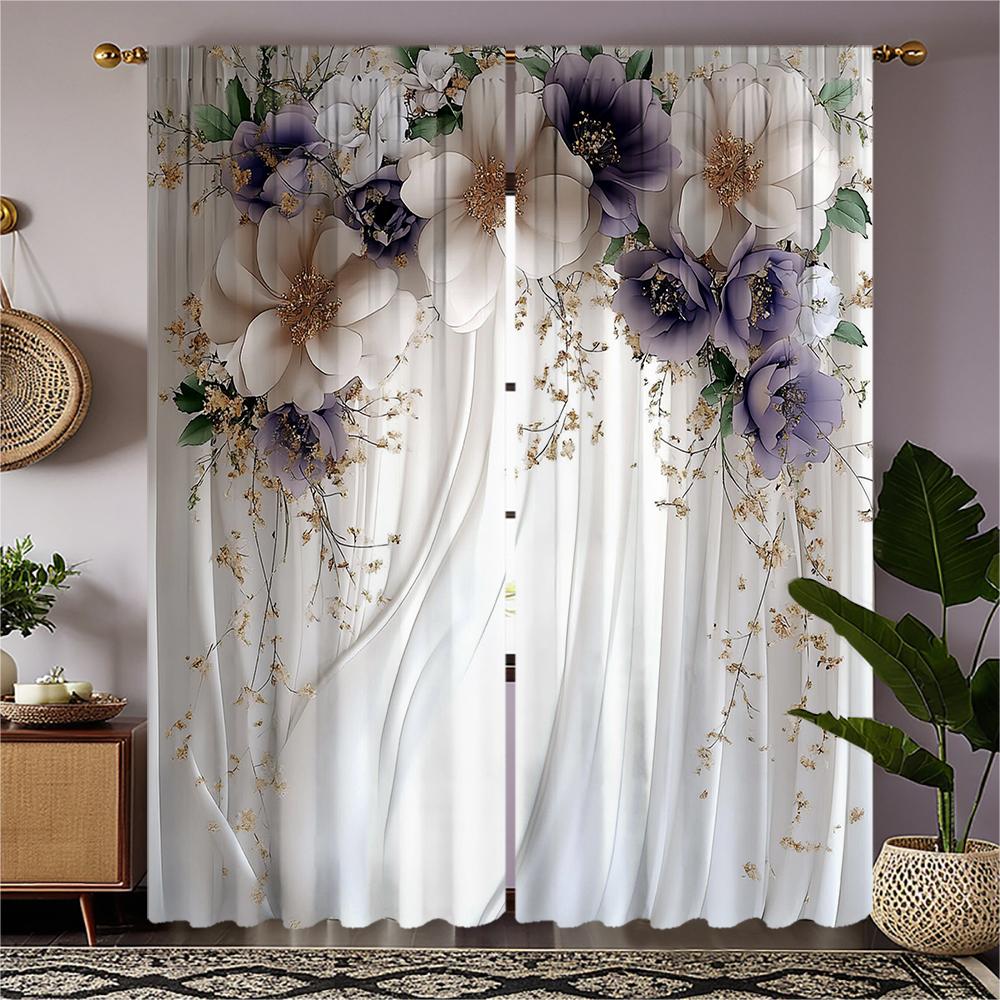 2-piece set of high-definition digital printed curtainwhite floral embroidered sheer curtain for rod pocketHome decoration style