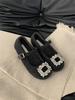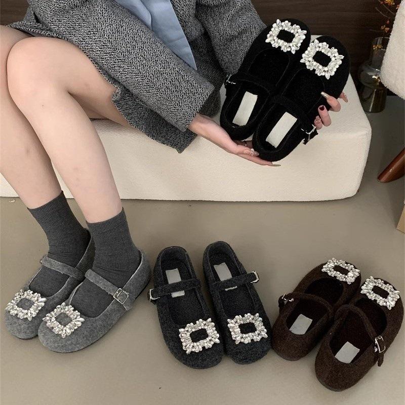 Flat bottom gray felt square head rhinestone single shoes 2025 autumn and winter velvet Mary Jane wool shoes