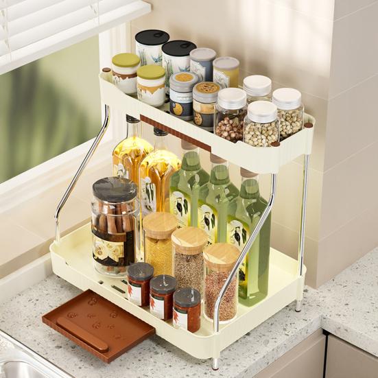 Maximerad nivåindelad lagring: Förskjuten design med två nivåer förvarar höga oljeflaskor, medelstora såsburkar och korta kryddbehållare samtidigt, vilket rensar ut röran på bänkskivan i ett organiserat utrymme..
