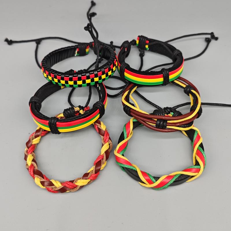 Upplev en livfull touch av Karibien med detta sexdelade set med justerbara vävda läderarmband. Varje armband har en slående färgblocksdesign i djärva röda, gula och gröna toner, som förkroppsligar Jamaicas anda.. Dessa armband är utformade för komfort och stil och kan bäras individuellt för ett subtilt uttalande eller tillsammans för en mer dynamisk look.. Den justerbara passformen säkerställer att de bekvämt passar olika handledsstorlekar, vilket gör dem till ett mångsidigt tillbehör för alla tillfällen.. Oavsett om du bär dem i lager för en boho chic stil eller lägger till en färgklick till en avslappnad outfit, är dessa armband designade för att fånga uppmärksamhet och fira individualitet.