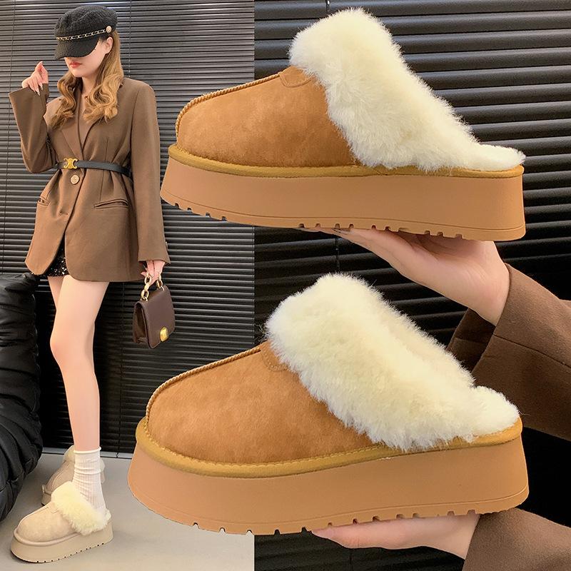 Thick-soled heightening, piled warm snow boots, half-towed fluffy cotton slippers, women's outer wear, new winter one-pedal