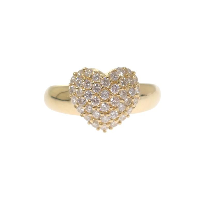 Production features:This heart-motif ring features 18k yellow gold arms paved with diamonds. The heart has a plump, thick, three-dimensional shape that captures light beautifully from any angle. This beautiful ring is perfect for yourself or as a gift for someone special.