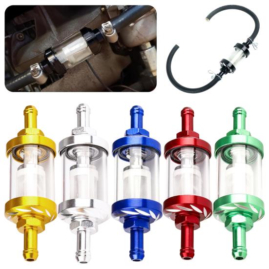 Detta högkvalitativa bränslefilter har en synlig genomskinlig glasdesign, vilket möjliggör enkel visuell kontroll av bränslets skick för att säkerställa optimal prestanda. Den fångar effektivt upp partiklar och förhindrar att föroreningar i bensin skadar din förgasare.. Den förtjockade bränsleslangen är motståndskraftig mot olja, kyla och etanol och kan enkelt kapas till rätt längd för mångsidiga användningsområden..