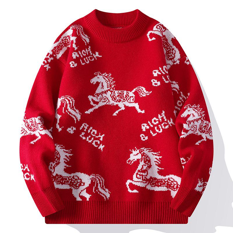Celebrate the Year of the Horse in style with this vibrant Unisex Festive Red Sweater. Featuring a loose fit and a comfortable round neckline, this sweater is perfect for enjoying festive occasions in cozy warmth. The long sleeves offer extra coverage, making it ideal for cooler weather. Crafted entirely from durable and soft acrylic material, it provides a gentle touch on the skin. This knitwear piece blends traditional Chinese zodiac themes with modern fashion, making it a versatile addition to any wardrobe. Whether you're joining a festival or simply enjoying a casual outing, this sweater captures the spirit of the celebration.
