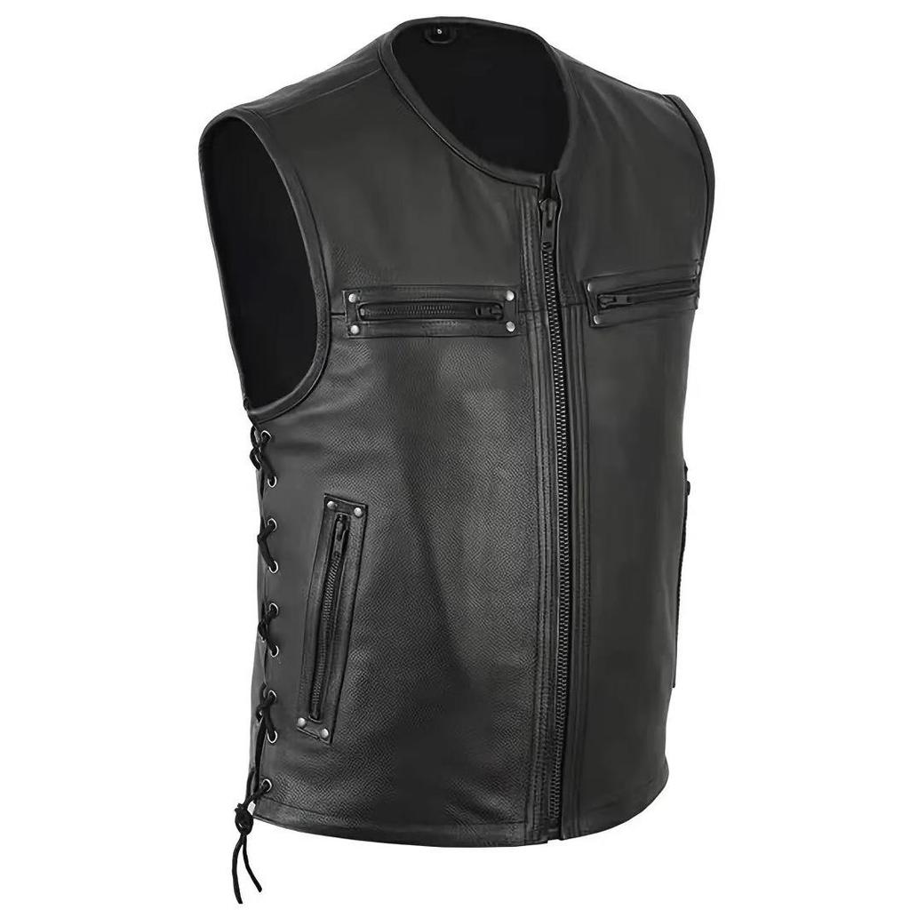 Denna snygga läderbikerjacka har en modern ståkrage, vilket ger en modern twist på en klassisk design.. Skräddarsydd för män, den kombinerar tidlös dragningskraft med aktuella modetrender.. Denna väst är tillverkad av högkvalitativa material och är perfekt för att lägga till en robust men ändå sofistikerad touch till vilken outfit som helst, vilket gör den till ett mångsidigt tillägg till varje garderob.