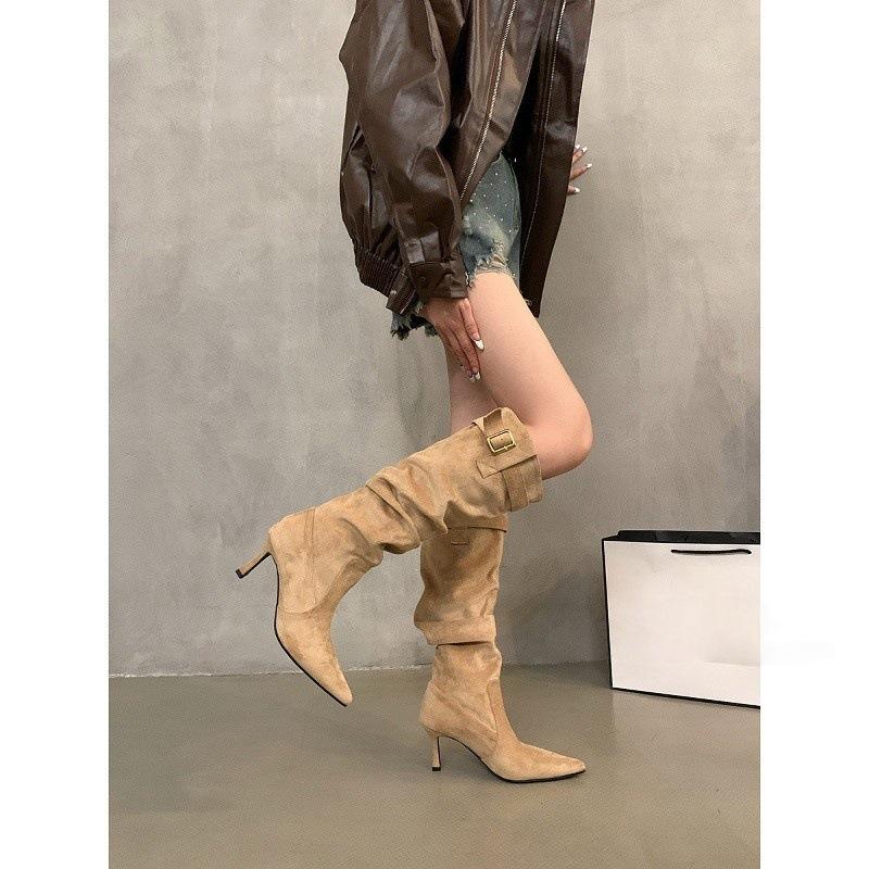 High Heel Boots Pointed Head Brown Skinny Boots Long Knight Boots Spring and Autumn Temperament Pile Long Boots