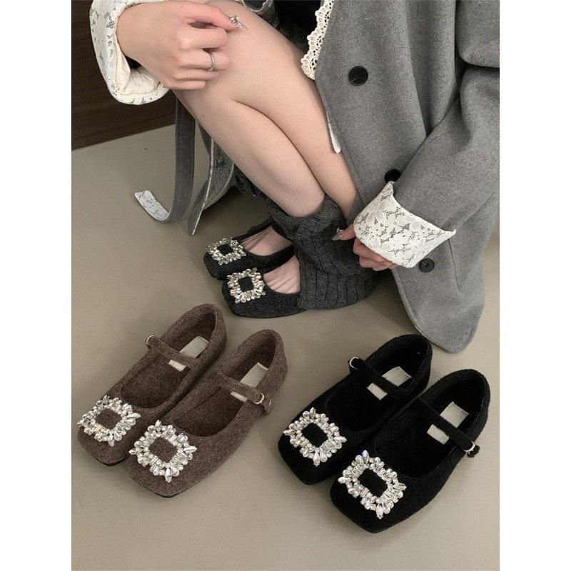 Flat season velvet square buckle rhinestone fluffy shoes femininity Mary Jane single shoes thermal cotton shoes