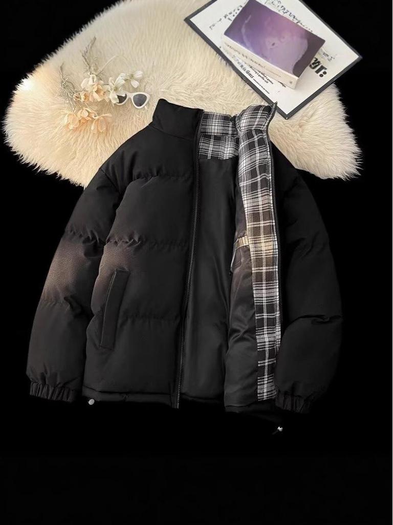Stay stylish and cozy with this unisex black plaid patchwork cotton jacket, perfect for cold winter days. Designed with a warm stand collar, this outerwear piece seamlessly merges fashion and functionality. Made primarily from polyester material, it offers a comfortable fit while ensuring durability. The jacket's fur lining is crafted from polyester fiber, providing added insulation for optimal warmth. Ideal for daily wear, this versatile piece is a must-have addition to any winter wardrobe.