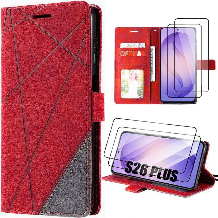 Coque pour Samsung Galaxy S26 Plus, Protection Anti-Rayure Synthécuir Rouge Gris - 2 Verres Trempés