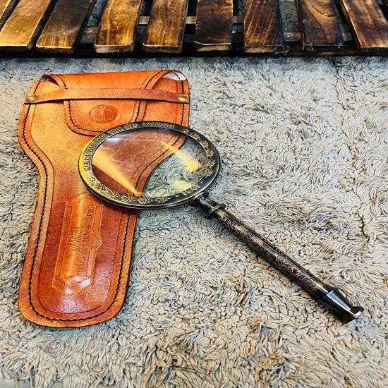 Ge din arbetsplats tidlös elegans och praktisk nytta med denna mässingsförstoringsglas för skrivbord med läderfodral, inspirerad av klassiska brittiska nautiska instrument.. Tillverkad i en rik antik mässingsfinish och parad med ett premiumläderfodral, denna förstoringsglas återspeglar arvsstilen hos Henry Hughes Son London, 1941, vilket gör det till en utmärkande pjäs för både samlare och inredningsälskare.