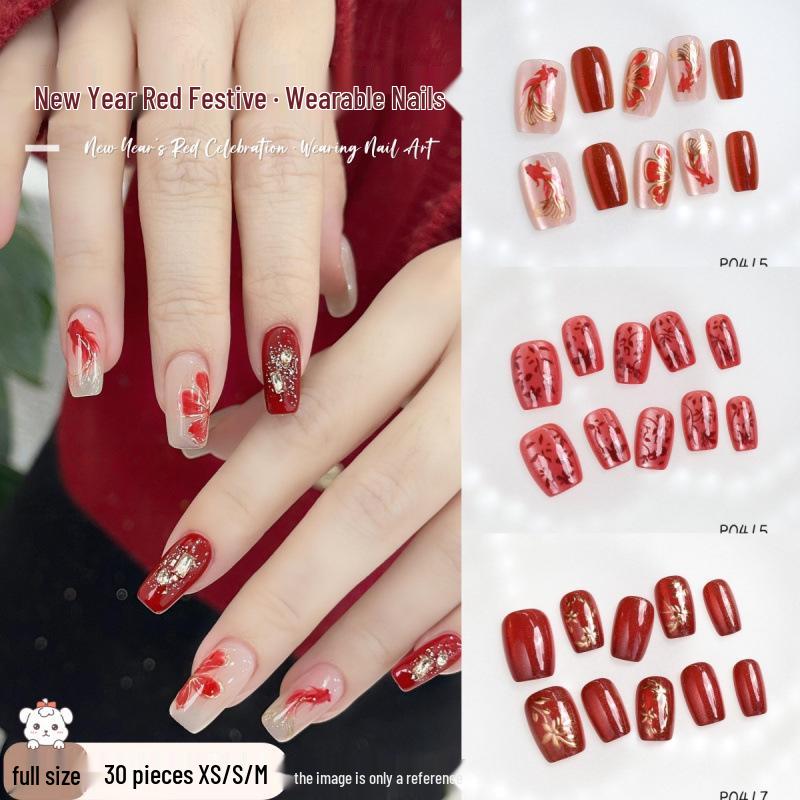 Festive Koi Lucky Red Cat Eye Wearable Nails - 30-Piece Set for New Year & Spring Celebrations