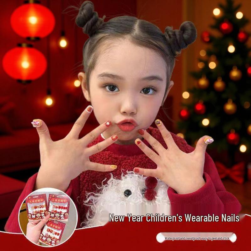 Children's Red Festive New Year Nail Stickers - Self-Adhesive Wearable Nail Art with Cat Design for Girls
