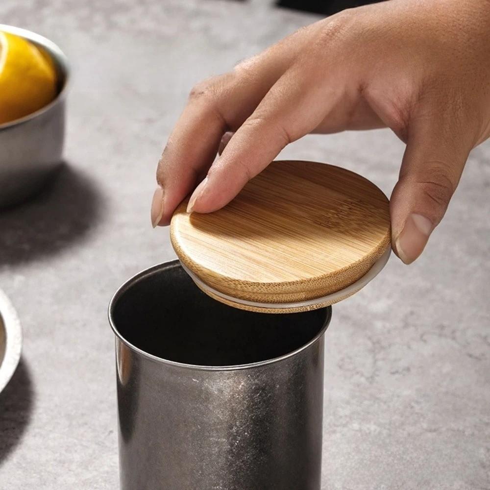 Retro Style Coffee Storage Jar 304 Stainless Steel Woodiness Lid Coffee Bean Storage Round Shape Seal Making Tea Can Kitchen Use