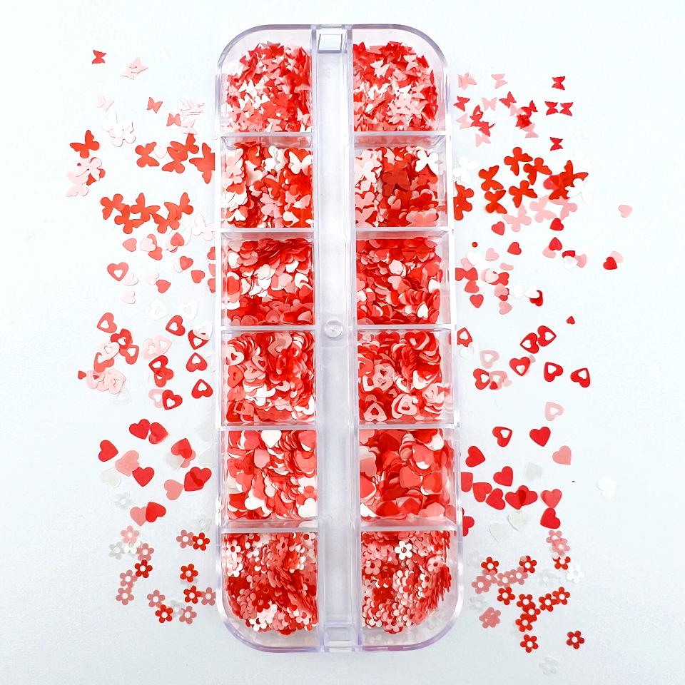 12-Grid Valentine's Day Nail Art Box: Pink Butterfly, Flower, Heart, and Mixed Sequins in Pink, White, and Red.