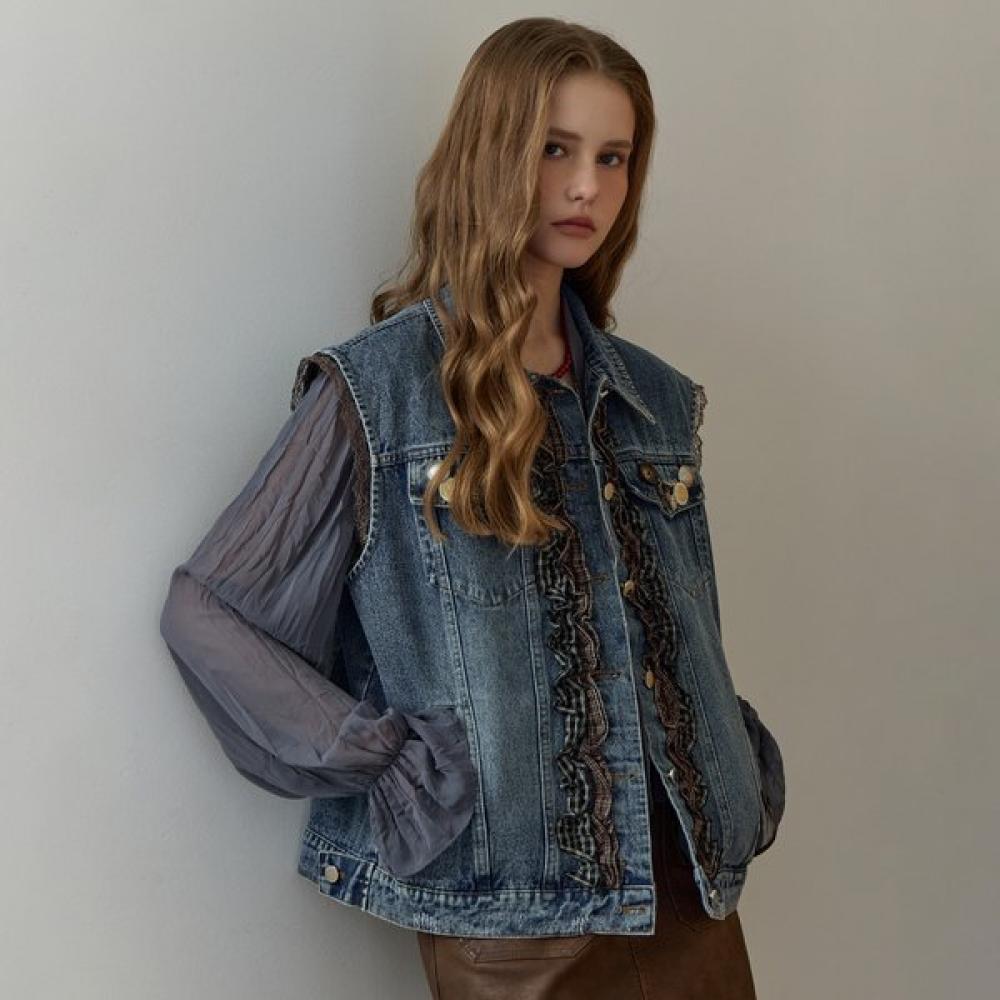 The MAZZA Check Ruffle Trimming Denim Vest features vintage washed denim with ruffle trimming, emphasizing a feminine mood.