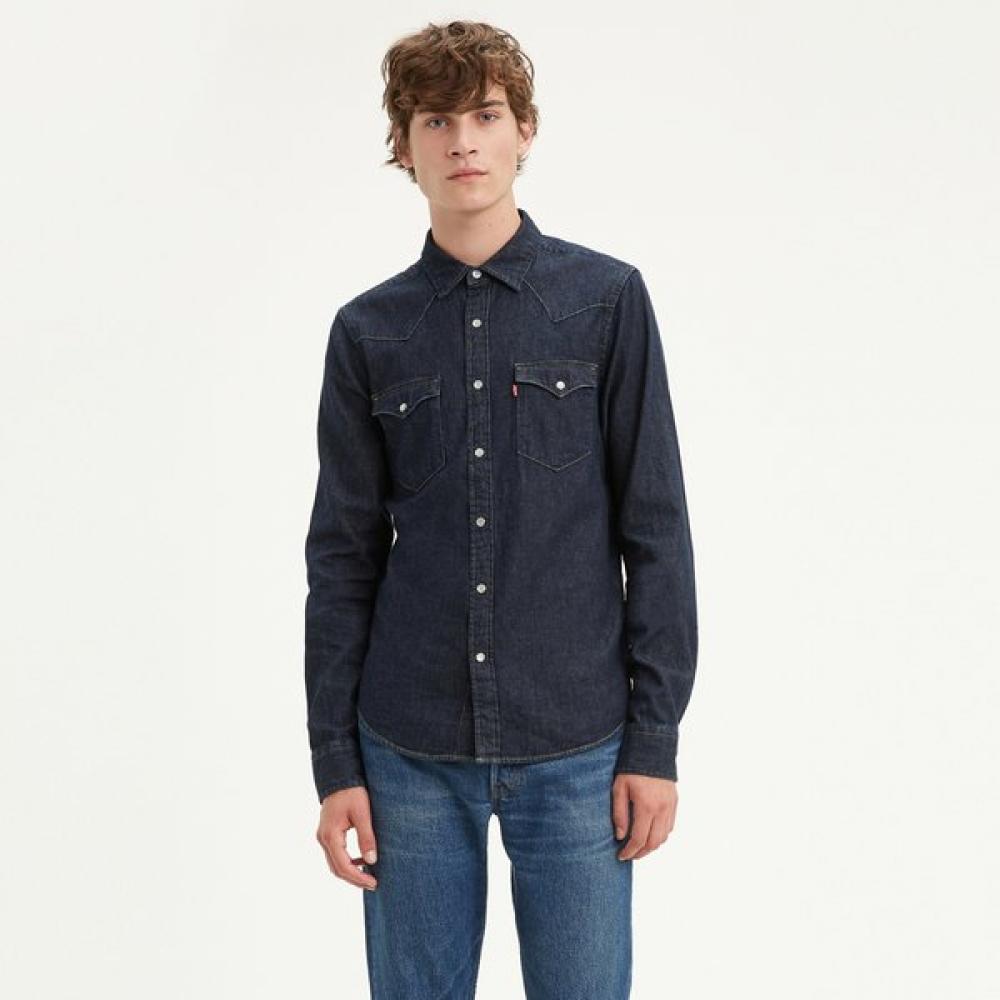 The Levi's Men's Classic Western Standard Denim Shirt 857450002 (85745-0002) features original western yoke details, a chest pocket, and a snap front finish, made of durable denim fabric. It is a classic western style standard fit shirt that can be neatly styled by tucking it into pants. Available in dark blue denim color.