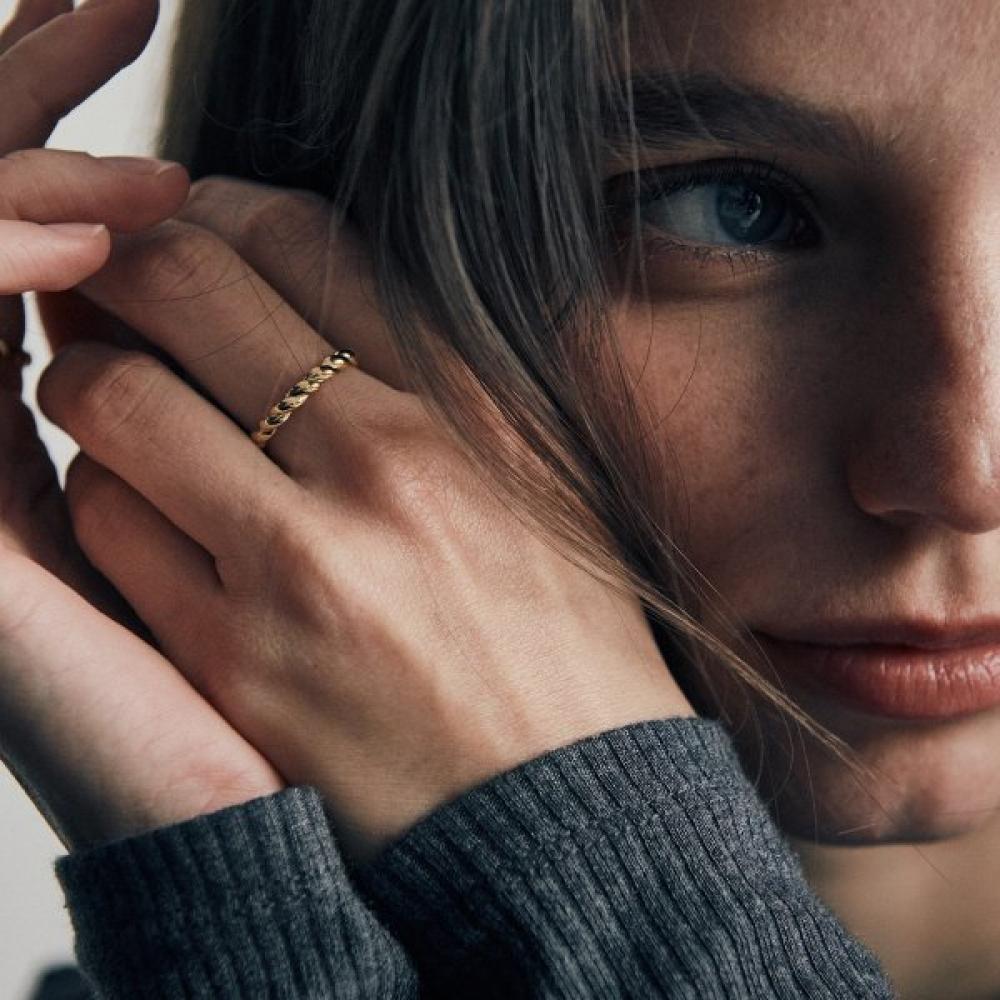 The 925 silver Cinq.silver.213 / epais bout ring (gold) is a thick twisted ring resembling a rope. With its basic twist and moderate thickness, it is suitable as a statement thumb ring and can be styled in layers when worn with a bout ring.