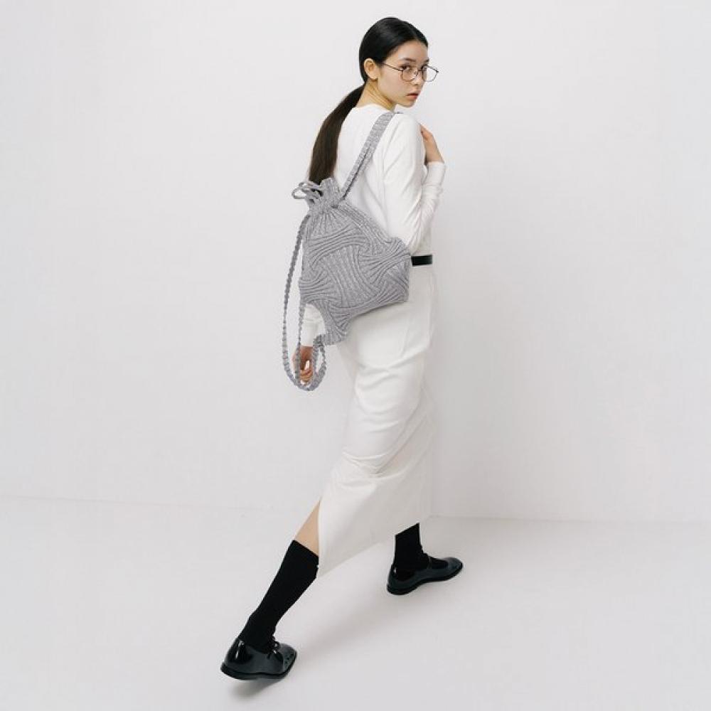 The New Bow Backpack Glitter Silver is a unique design backpack made with sparkling glitter yarn. With tension-friendly shoulder straps and handles inspired by embossing rope, it can be styled in three ways and accommodates up to a 13-inch laptop. Due to the characteristics of the knit and pleat designs, the width and height can flexibly stretch.