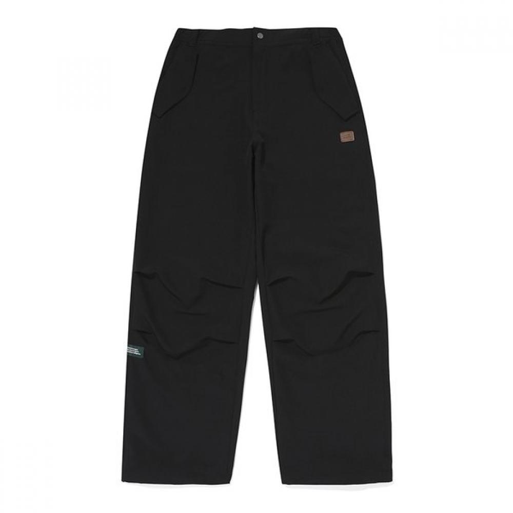 The Stretch Brush Relax Pants (Black) is crafted from soft stretch brush material with a brushed inner layer, providing comfort while wearing. It features a parachute-style minimal design and a simple yet stylish leather emblem detail.