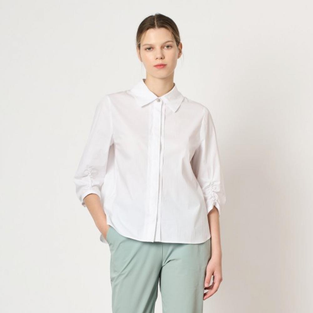 The BCBG Volume Sleeve Shirt B4F8B430 is a half-sleeve collar shirt created with a clean color palette and comfortable silhouette. The voluminous sleeves are the highlight, enhancing the feminine look, and it is suitable as a business blouse while also being versatile for office wear. The half-length sleeves make it perfect for wearing from summer to autumn.