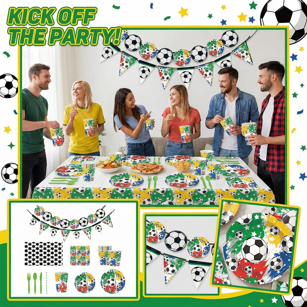 One tablecloth and one banner, 10 paper cups, 10 each of 9-inch and 7-inch paper plates, 10 each of knives, forks, spoons, straws, and popcorn buckets, and 20 napkins.