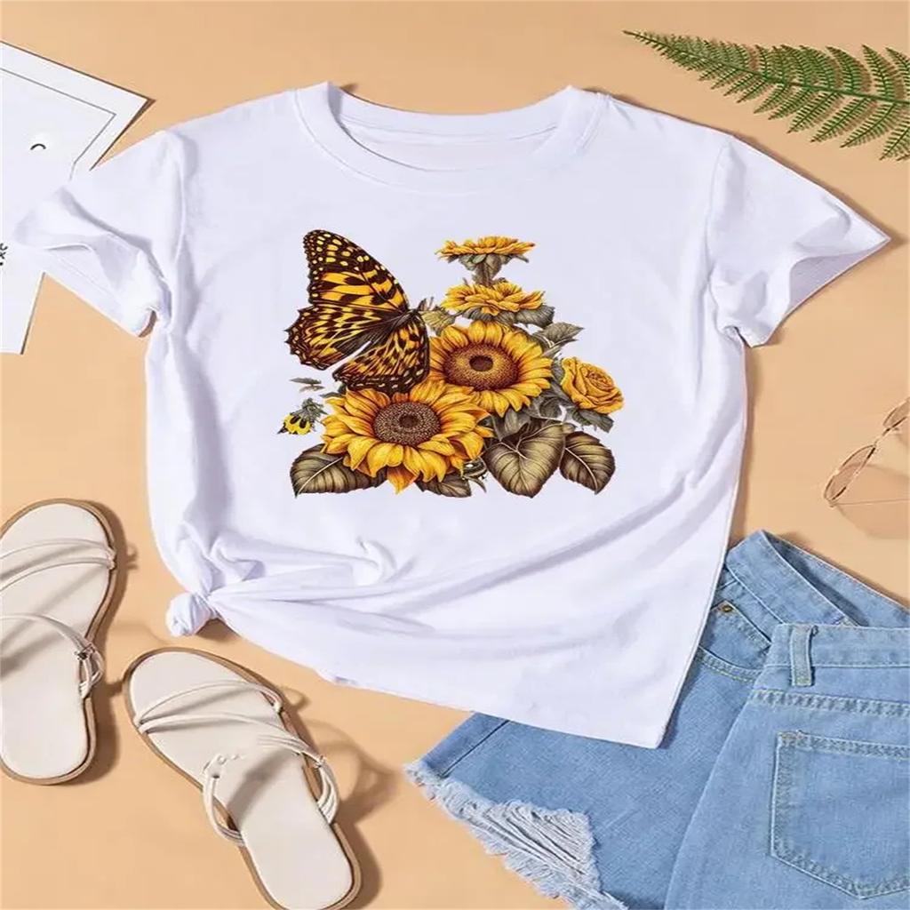 Clothes Short Sleeve Graphic T-shirt Women Top Fashion O-neck Sunflower Butterfly Trend Clothing Print Lady Female Shirt Tee