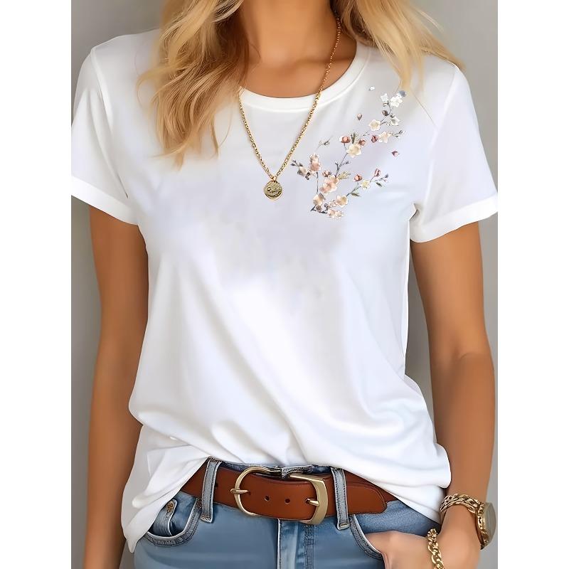 European Size Women's Comfy Blend T-Shirt with Floral Print - Casual Round Neck, Stretch Fit, Machine Washable