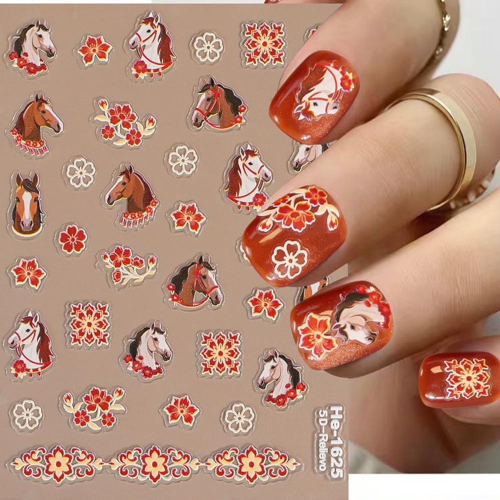 5D Embossed Cartoon Nail Art Stickers: Galloping Horse & Red Flower Wreath He1625
