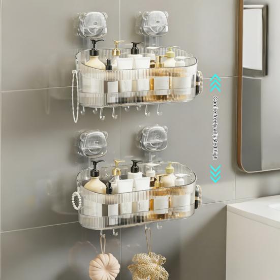 Förvaring med stor kapacitet med starka sugkoppar som tål hög belastning: Detta hyllplan är utformat för att maximera ditt badrumsutrymme och erbjuder gott om plats för att rymma flera flaskor, toalettartiklar och tillbehör samtidigt.. Kombinationen av en öppen förvaringslåda och praktiska krokar erbjuder mångsidiga organiseringsmöjligheter, så att du kan förvara föremål snyggt samtidigt som du har det väsentliga inom räckhåll.. Dess robusta sugkoppar stöder säkert tunga laster utan att glida eller falla.