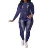 Denna damoutfit är tillverkad av ett andningsbart, lätt polyestertyg som garanterar komfort och stil under vår och höst.. Designad med ett imiterat denimtryck, erbjuder den den klassiska denimlooken samtidigt som den är lätt och bekvämare än traditionella denimkostymer.