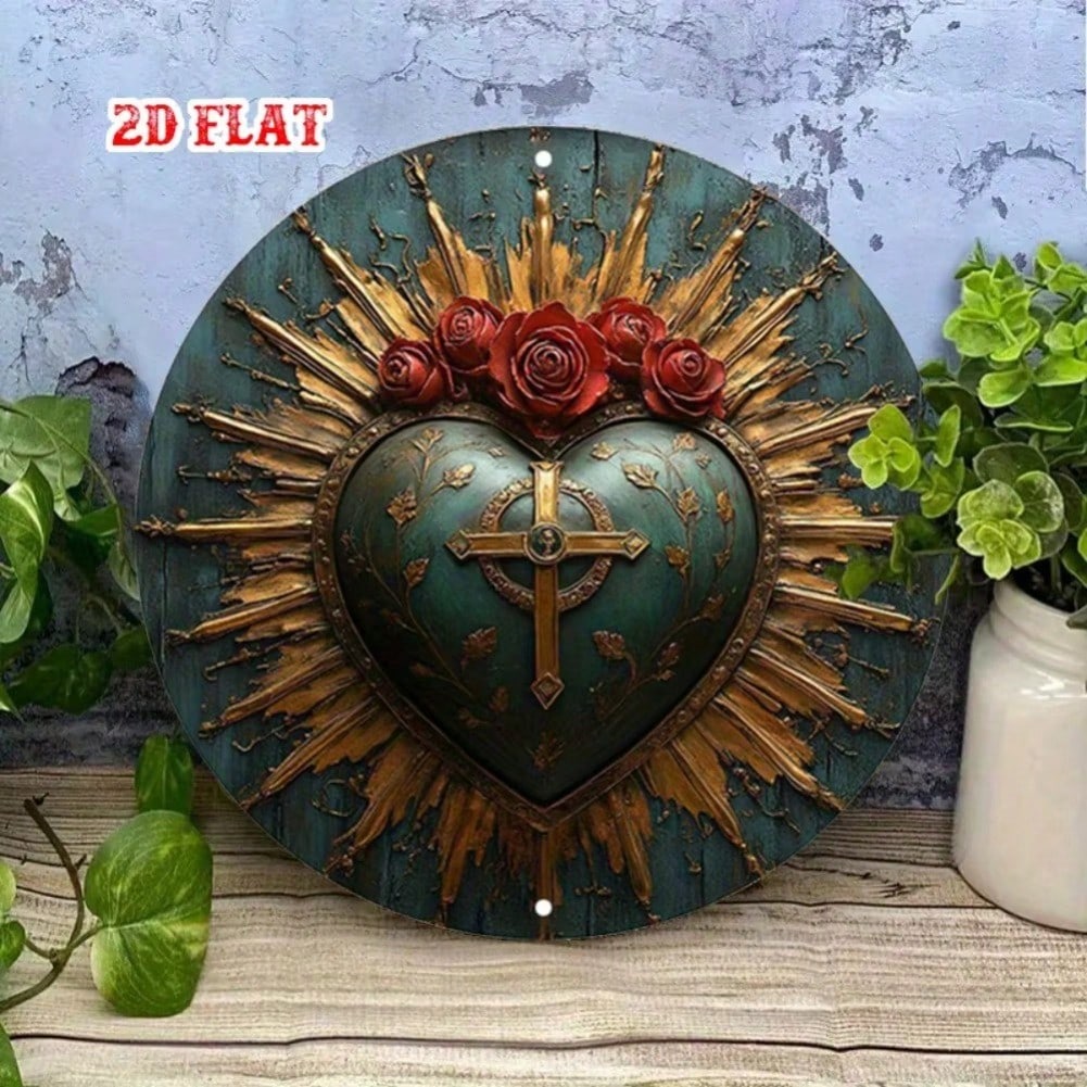 Vintage Metal Wall Art Sacred Heart Cross Sign Rustic Rose Decor for Home Cafe