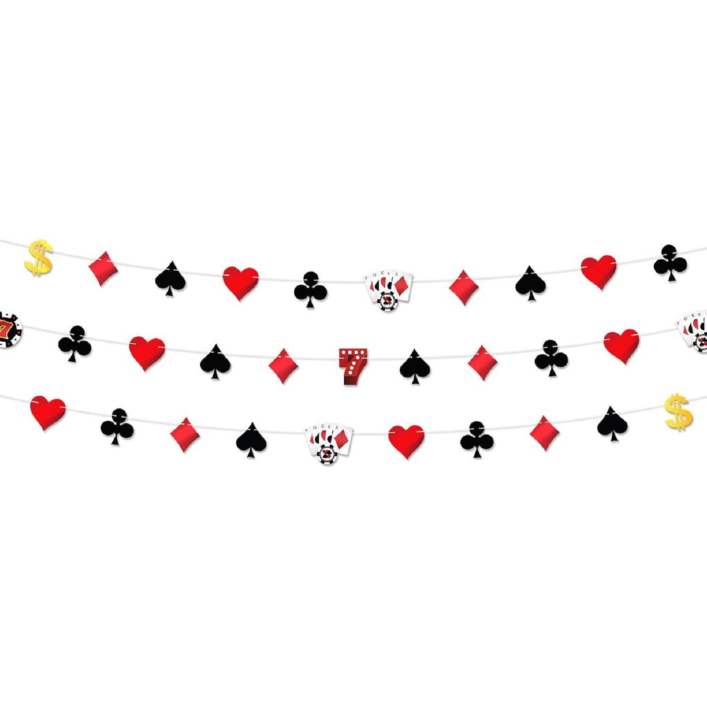 STRING 3, PRE STRUNG - The banner is adorned with delightful casino themed graphics, each casino party garland comes with 7 different poker patterns, such as spades, hearts, clubs, dice, chips, etc., rich and bright color to bring an eye catching addition to your party, while making memories with the poker themed banner garland including dice and poker chips, capturing the essence of a thrilling casino birthday decorations or casino night decorations or vegas themed party decorations.