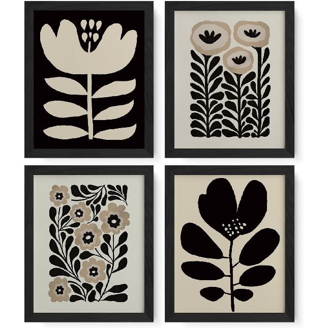 JXREQ Vinatge Boho Abstract Matisse Floral Wall Art, Mid Century Modern Abstract Black and Beige Floral Wall Decor for Home Kitchen Bedroom Bathroom