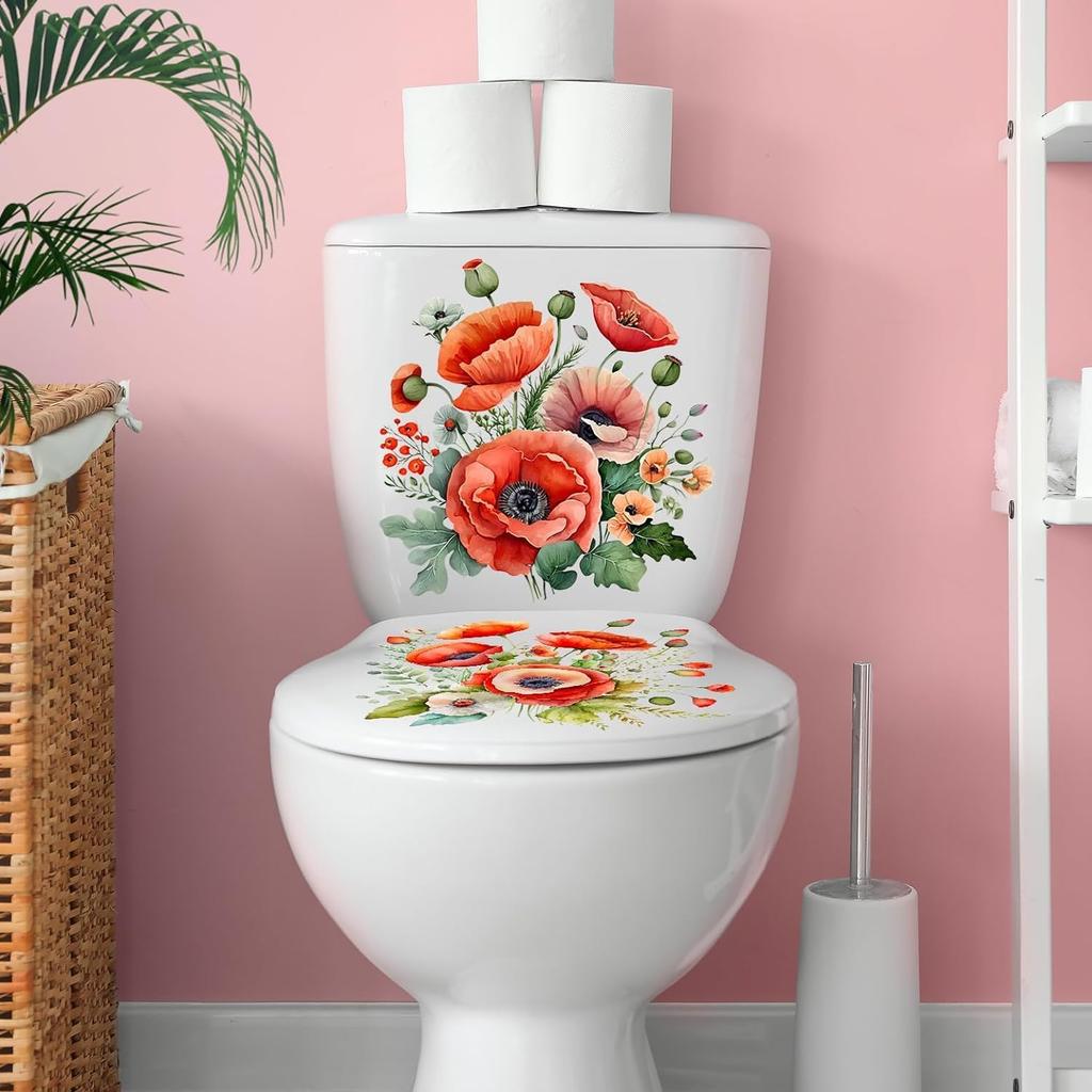 3Pcs Red 3D Poppy Flowers Toilet Seat Wall Sticker Self-Adhesive DIY Removable Watercolor Bouquet Toilets Stickers for Cistern Bathroom WC Restroom