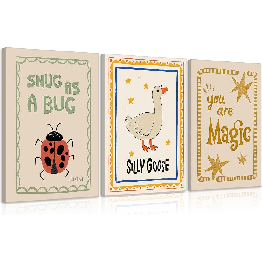 Funny Nursery Art: This set of posters consists of three prints: "Silly Goose," "Snug as a Bug," and "You Are Magic," each with its own unique character and mood. One is silly, one is cozy, and one is full of wonder. Whimsical, playful, and perfectly balanced, this trio will brighten any space