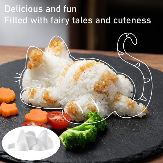 Bedårande kattformad design: Med en charmig kattsilhuett ger denna form en lekfull touch till dina kulinariska skapelser.. Dess släta insida gör det enkelt att fylla och lossa, vilket gör det möjligt för användare på alla nivåer, inklusive nybörjare och barn, att enkelt skapa söta, perfekt formade risbollar.. Förhöj din presentation med rolig och iögonfallande sushi.