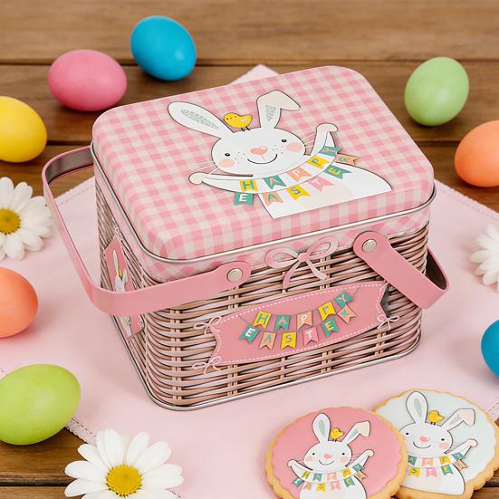 Hållbar plåtkonstruktion: Det solida plåtlocket har ett utsökt påsktema.. Lådan har en robust metallram och ett avtagbart handtag för enkel bärning, vilket gör den idealisk för utomhuspicknickar eller bekväm förvaring.