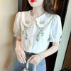 Women's Peter Pan Collar Blouse Short Puff Sleeve Floral Embroidery Casual Top Shirt