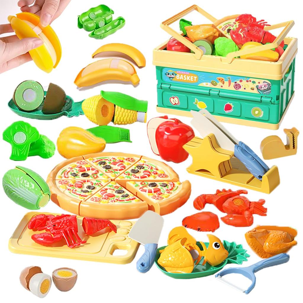 La Gacela Pretend Play Set with Storage Kitchen Pretend Luxury Birthday Kitchen Toy 55-Piece Vegetables, Fruits, Tableware, Seafood, Basket, Toy,