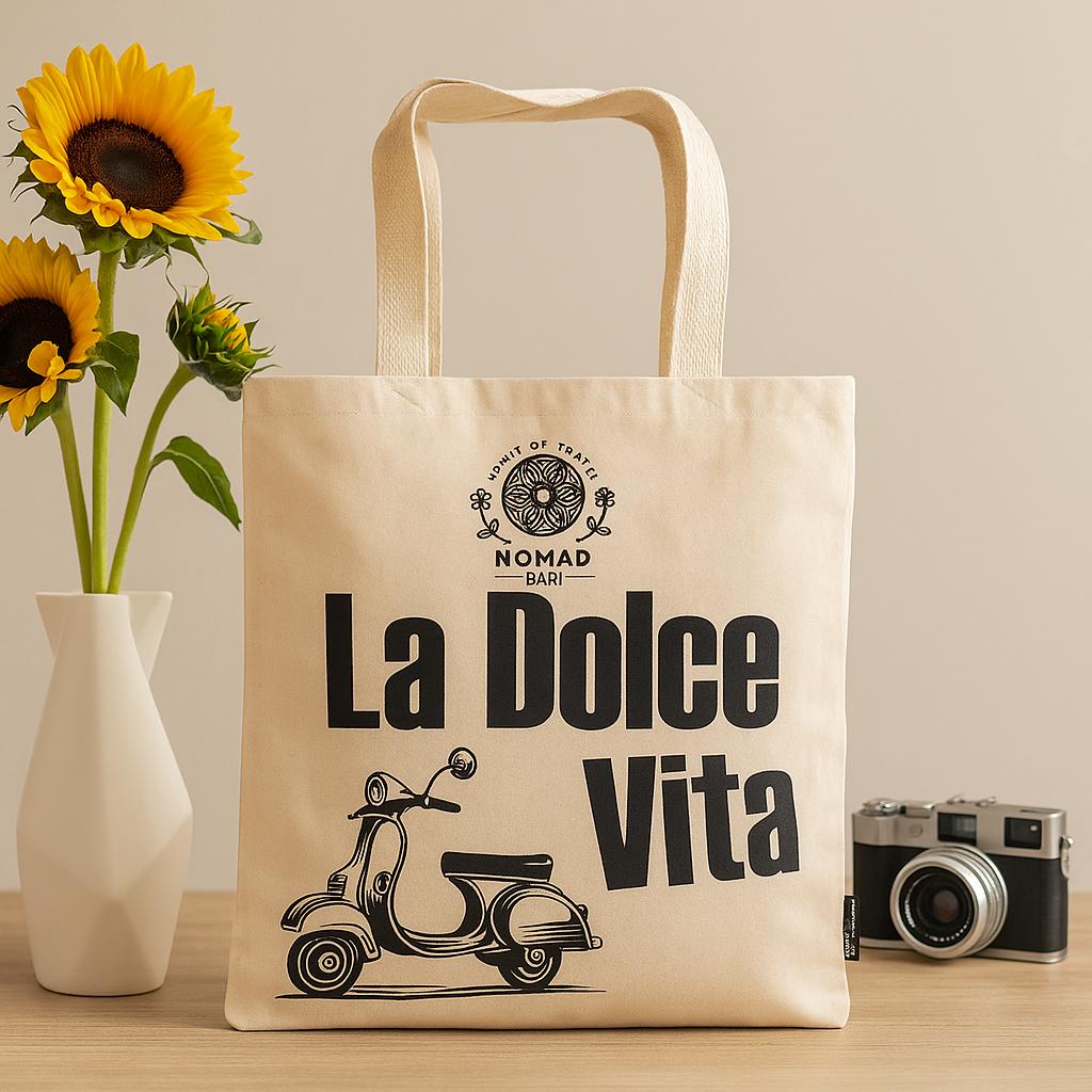 Made from a canvas-style fabric in natural off‑white, it feels sturdy yet comfortable on the shoulder. Clean stitching, two flat straps, and an open top make loading and reaching for essentials effortless. The minimalist black print — “La Dolce Vita” with a classic scooter drawing and a small “Enjoy the ride” script — brings a quiet, playful charm. A discreet woven side tag completes the look without fuss.