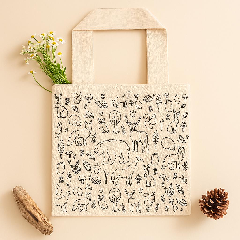 Made from a durable, canvas-like fabric, it feels dependable in the hand and gentle on the shoulder. The natural/off-white body sets a clean backdrop for hand-drawn woodland motifs — bears, foxes, rabbits, squirrels, deer, mushrooms, acorns, and leaves — rendered in simple monochrome. Long, flat straps rest comfortably for all-day use. An open top, finished edge, and neatly stitched seams keep the silhouette clean and reliable.