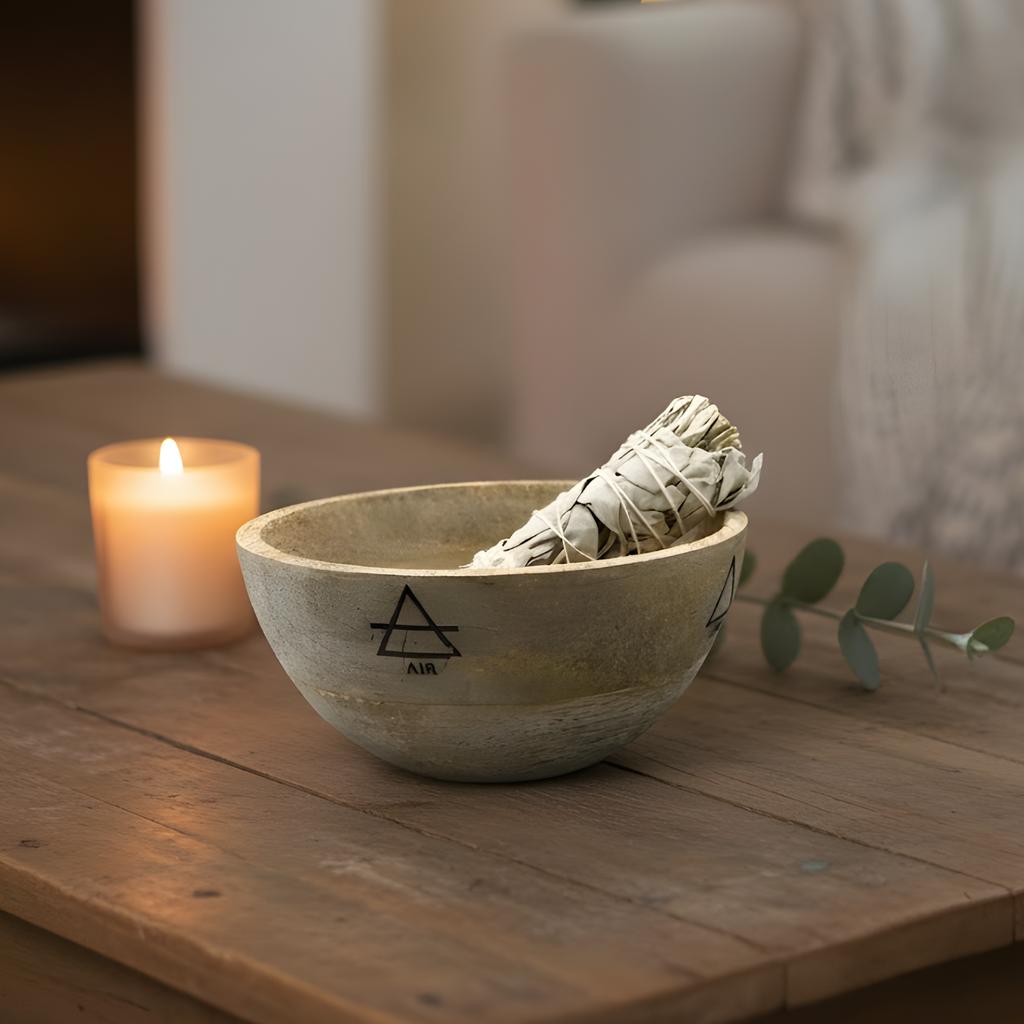 Shaped for daily ritual, it holds what matters: a small vessel of water, flower petals, salt, grains, or herbs awaiting smudging. For incense resins or cones, place a heat-safe dish or a bed of sand inside to protect the wood. The subtle black glyph encircling the exterior is the alchemical symbol for Air — an upward triangle crossed by a horizontal line — a reminder of breath, clarity, and the space between thoughts. In many traditions, the four elements are honored as facets of balance; Air is often associated with communication, inspiration, and the renewing quality of the breath in meditation. 🌬️