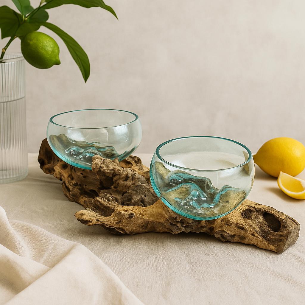 Stryk en hand längs den släta, glansiga ytan och en uppvikt kant; spåra sedan det råa träet under — knöligt ådring, kvistar, fina sprickor och böljande kanter. Skålen är asymmetrisk och öppen, dess botten formad efter träets ojämnheter, vilket skapar en stabil, skulptural passform.. Klart glas med små luftbubblor berättar historien om eld och andetag; trätonerna sträcker sig från ljusbeige till varmbrun, med mörkare kvistar som fördjupar utseendet. 🪵