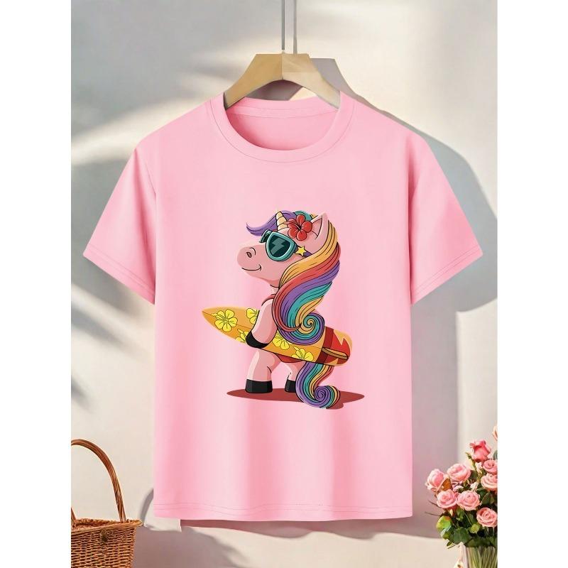 Europeiska storlekar Flickors Enhörnings Surf T-shirt - Söt Regnbåge & Enhörnings Grafisk T-shirt med Pastellfärger, Mjuk Rundhalsad Sommarskjorta för Strand,