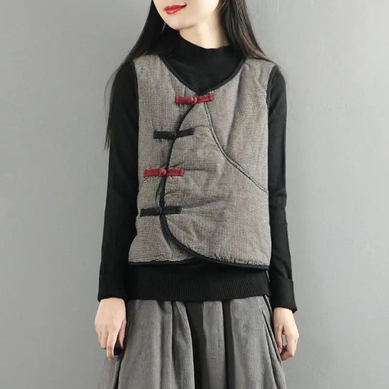 Women's Autumn Winter Chinese Style Frog Button Plaid Vest Retro Loose Sleeveless Waistcoat