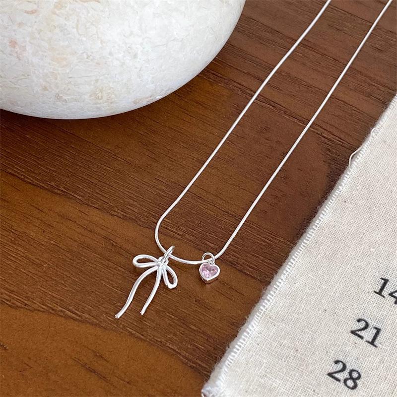 925 Sterling Silver Delicate Love Pink Diamond Bow Necklace ins Snake Bone Chain Collarbone Chain